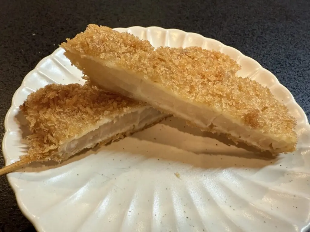 「焼きカレーパン」を半分に切ってみると、中にはたっぷりとカレーが入っていました。カレーにはゴロッとした大きな具が入っていて、食べ応えがあります。優しい辛さなので子どもから大人まで楽しめます。