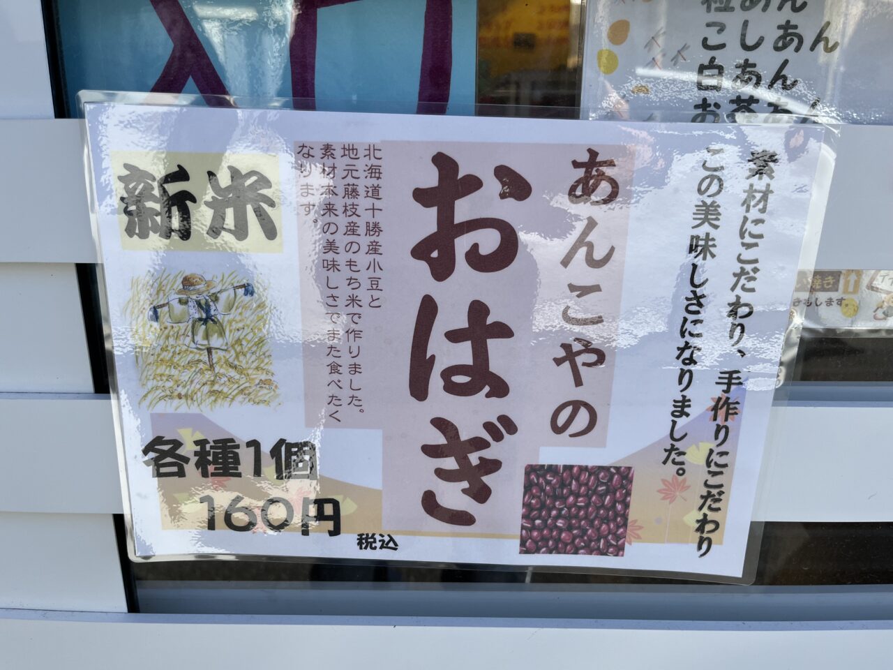 お店の前には「あんこやのおはぎ」と書かれている広告が貼られていました。「素材にこだわり、手作りにこだわりこの美味しさになりました。」「新米」と書かれていました。他にも「北海道十勝産小豆と地元藤枝産のもち米で作りました。素材本来の美味しさでまた食べたくなります。」と説明があり、とても美味しそうです。