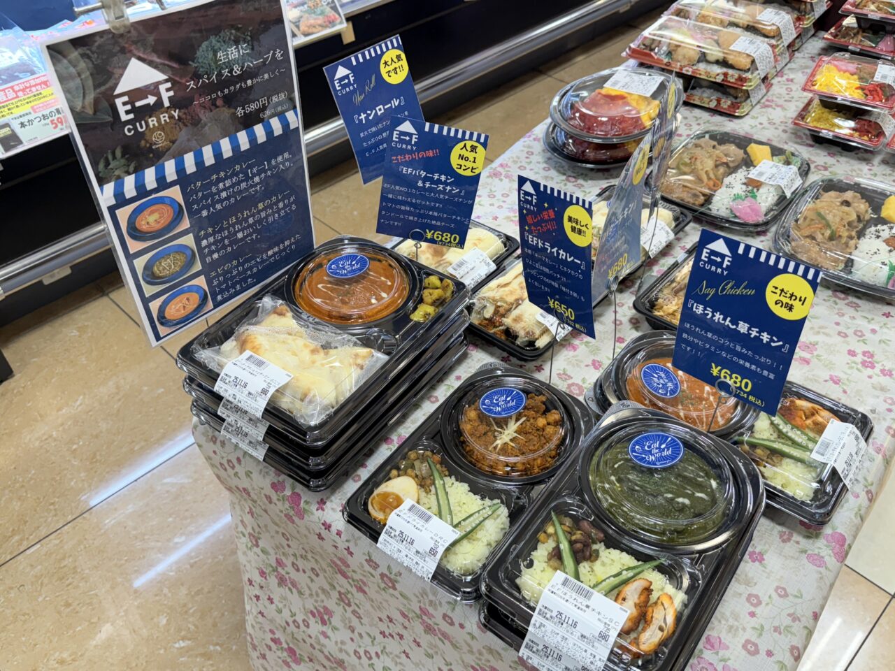 お弁当のコーナーにはE→F CURRYのカレーが並んでいました。ナンロール・EFバターチキン&チーズナン・EFドライカレー・ほうれん草チキンなど種類が豊富です。