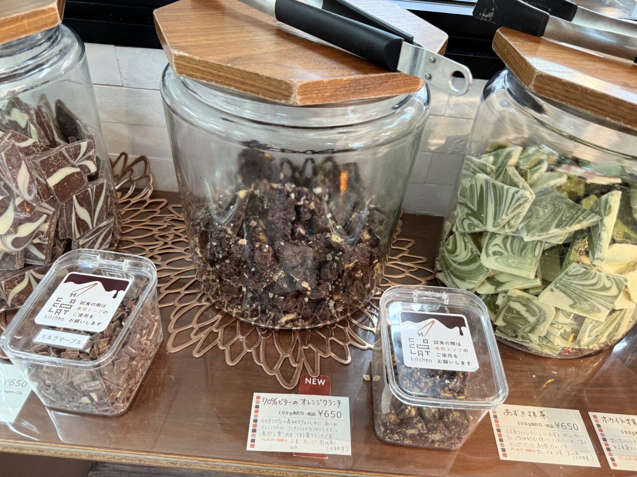 チョコレートの量り売りのコーナーに「70%ビターのオレンジクランチ」がありました。説明が書かれている場所に「NEW」のシールが貼られていました。