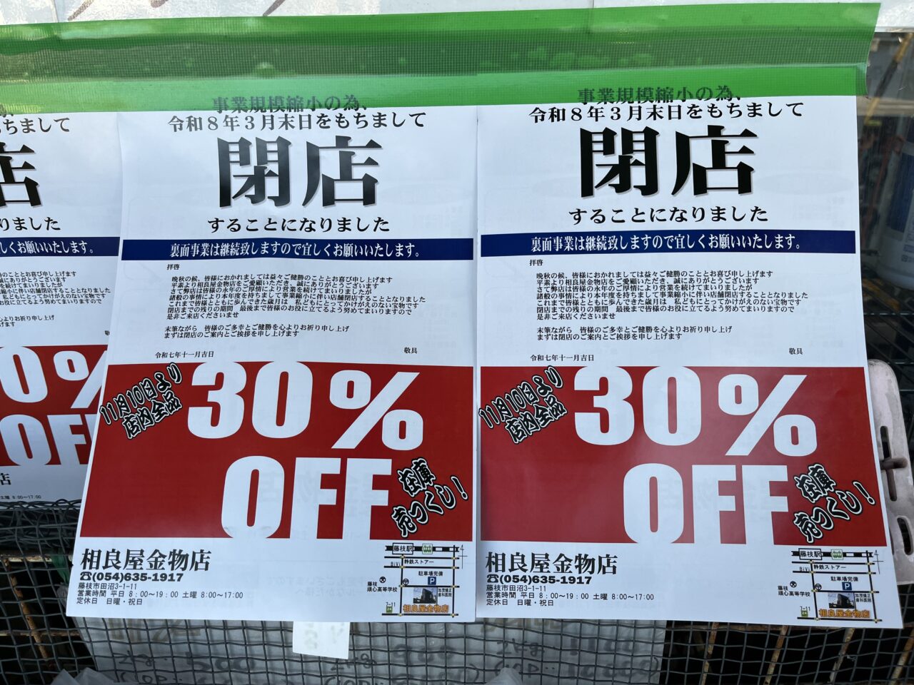 閉店のお知らせがありました。藤枝市田沼にある「相良屋金物店」が令和8年3月末日をもって閉店するそうです。