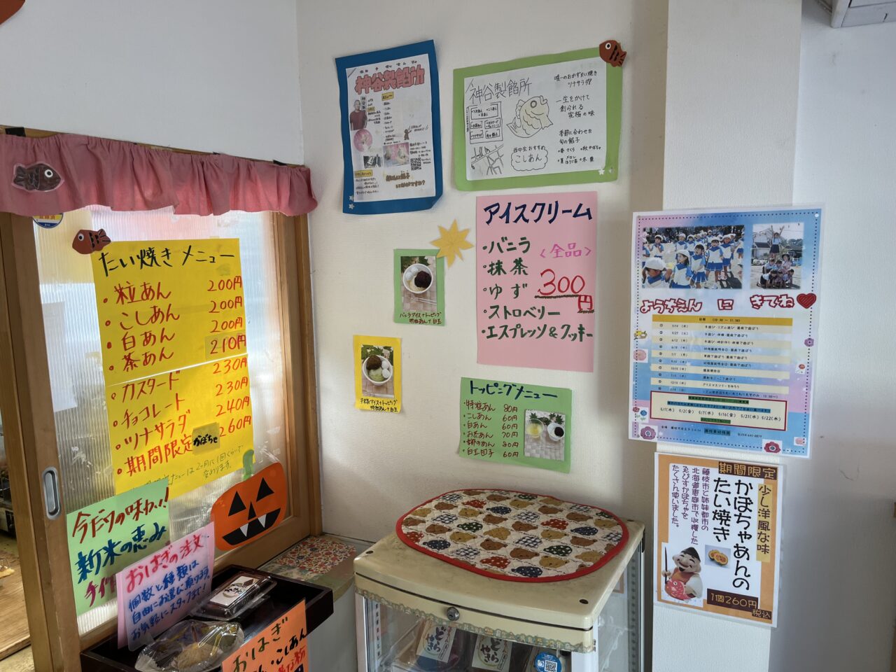 お店の中にはたい焼きメニューやアイスクリームなどのメニューがありました。たい焼きは粒あん、こしあん、白あん、茶あん、カスタード、チョコレート、ツナサラダなどがありました。種類が豊富で迷ってしまいます。