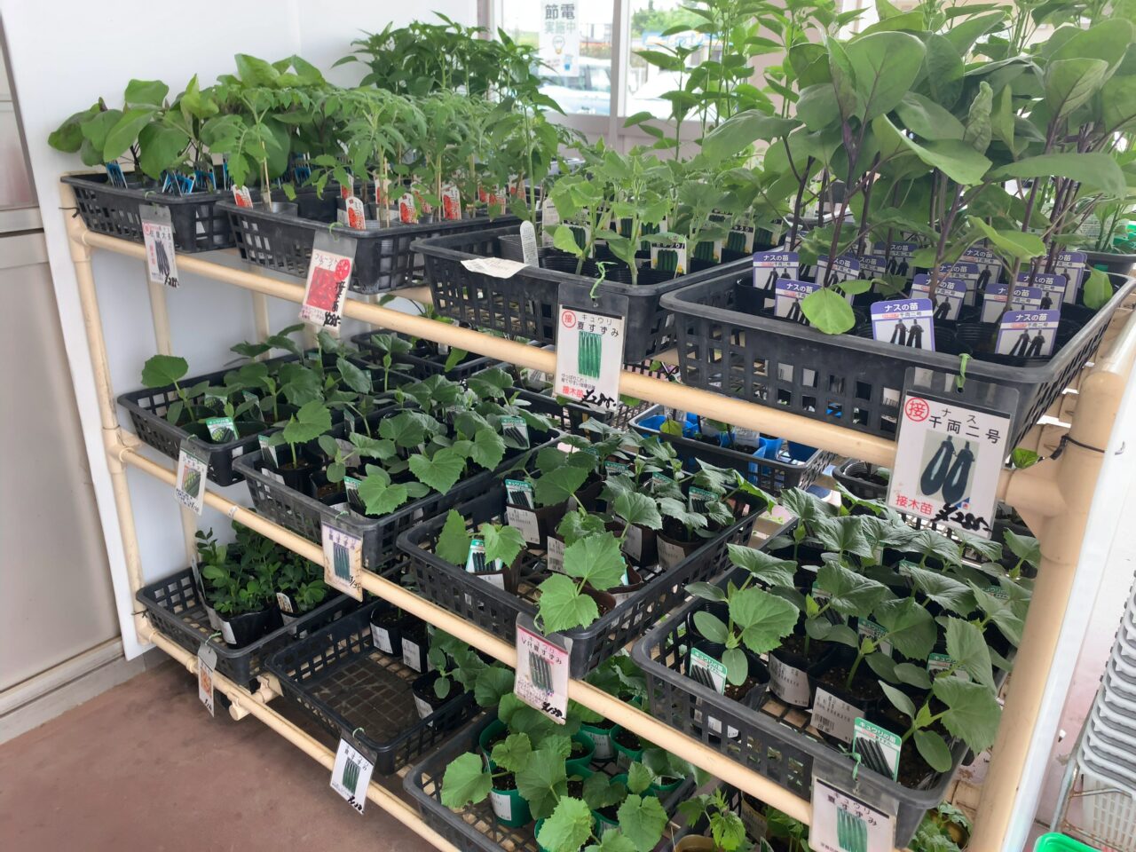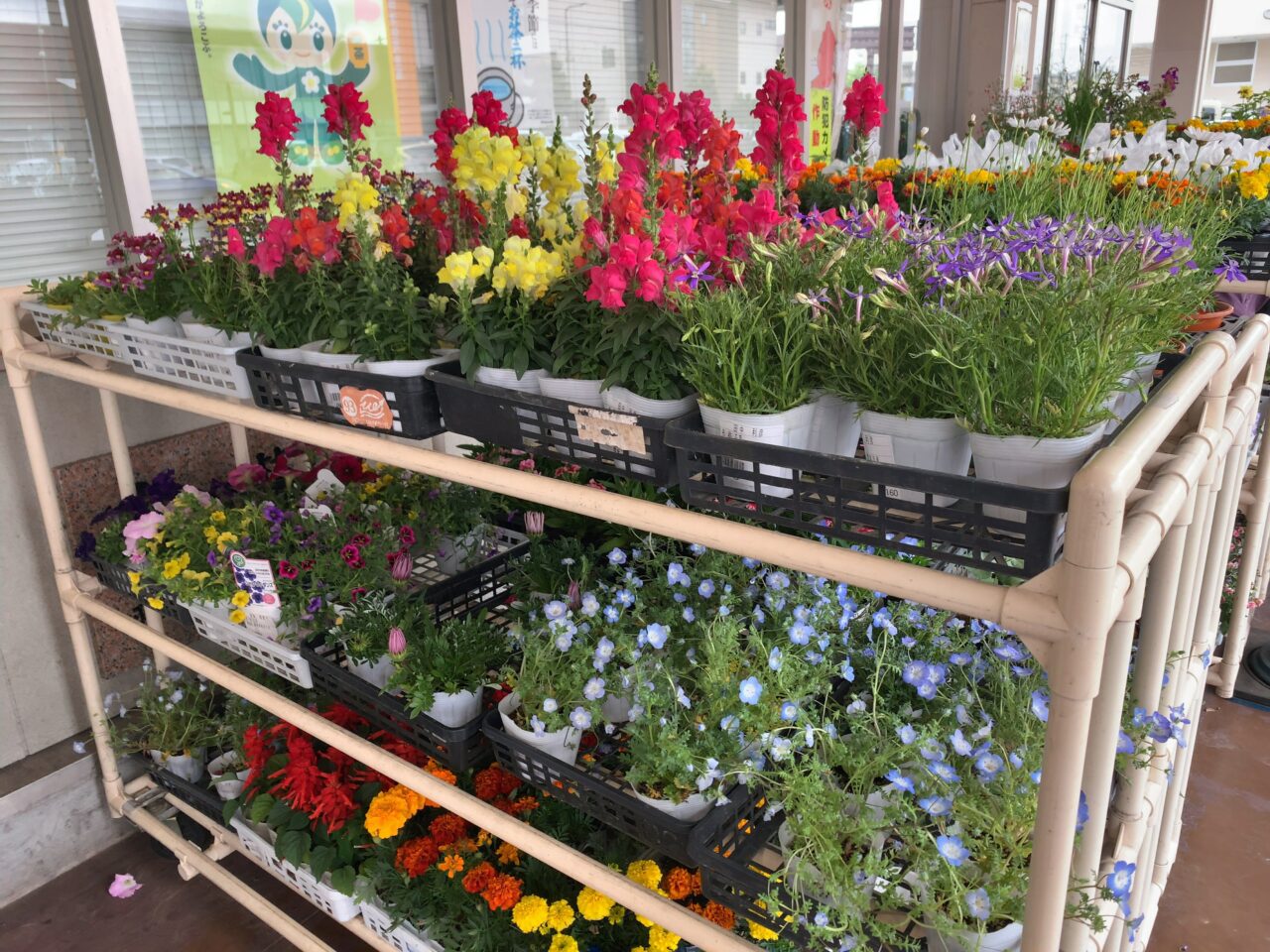 「ファーマーズマーケット まんさいかん」の店前には庭などに植える花も販売しています。他にも、野菜の苗などもあって自分で育てる楽しさも味わえます。