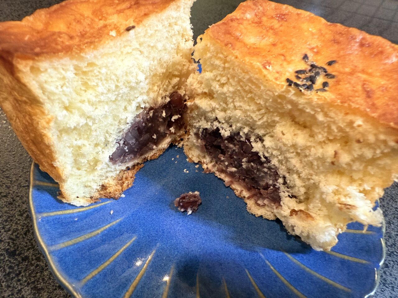 「しかくいあんぱん」を半分に切ってみると、中にはしっかりとした粒あんが入っていました。パン生地はケーキのような上品な甘さで、中の粒あんととても良くあっていました。和菓子のような洋菓子のような、とてもオシャレなパンでした。