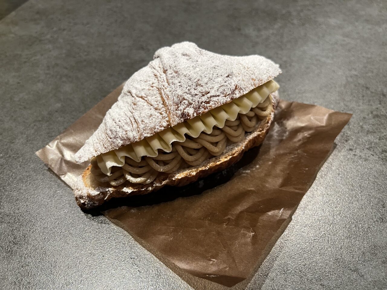 「モンブランバタークロワッサン」はとても綺麗にモンブランクリームが絞られていて、見た目も豪華です。食べてみると、優しい甘さのサクサクとしたクロワッサンと塩味のあるバター、濃厚なモンブランクリームがとてもよくあっていました。