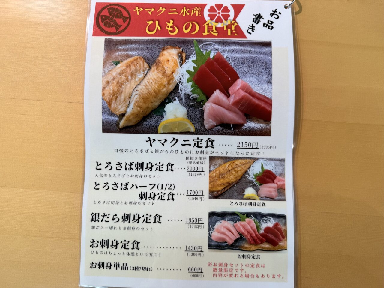 席に案内されるとメニュー表が机の上に置かれていました。炭火焼き定食には銀だら・とろさば定食、とろさば定食、オススメ三種定食、金目鯛・とろさば定食、ほっけ・とろさば定食、金目鯛・銀だら定食、ほっけ・銀だら定食、銀だら定食、とろあじ定食、いわし・ぎんだら定食、お子さま定食、日替わり定食などがありました。ひもの定食にはヤマクニ定食、とろさば刺身定食、とろさばハーフ刺身定食、銀だら刺身定食、お刺身定食などがありました。