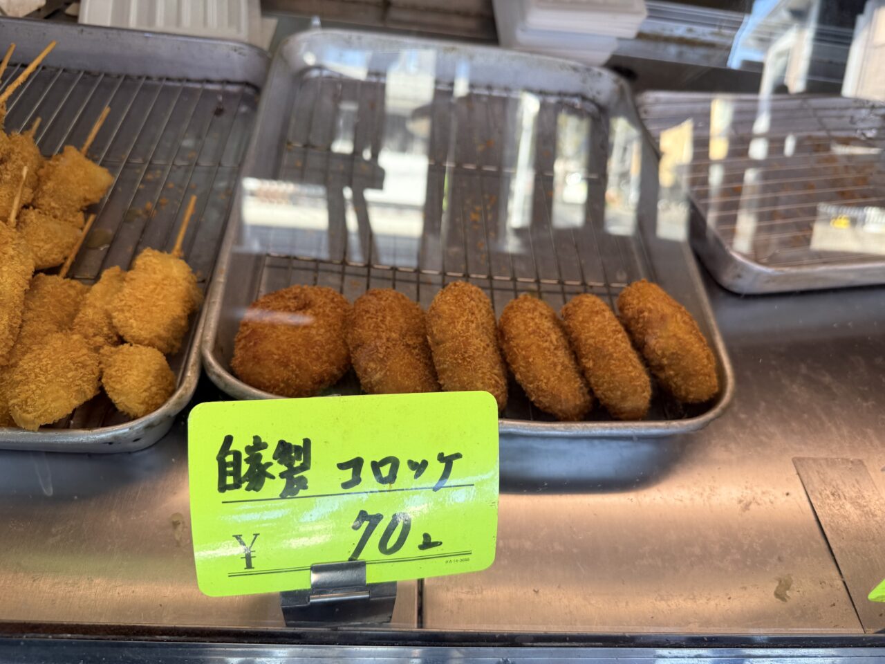 「自家製コロッケ」は1個70円で、お財布に優しい値段設定で嬉しいです。お店の方に購入したい商品をお願いするとパックに詰めてくれます。