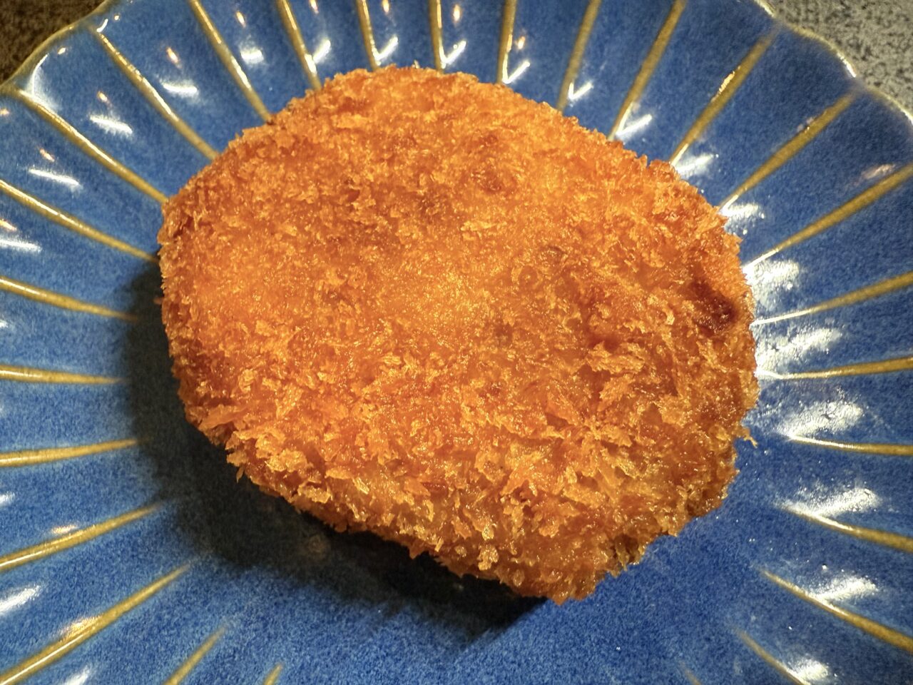 「自家製コロッケ」は綺麗な楕円型をしていて、こんがりとしたきつね色に挙げられています。