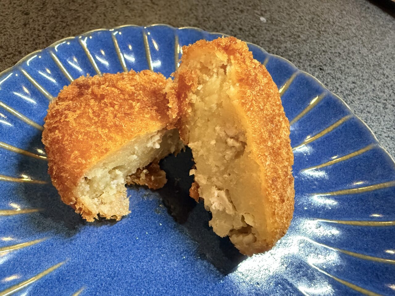 「自家製コロッケ」を半分に切ってみると、衣がとてもサクサクとしていました。中の具にはじゃがいもと鶏のひき肉が入っていました。コロッケには珍しい鶏のひき肉ですが、しっかりとした食べ応えがあって、昔から変わらない味がしていました。