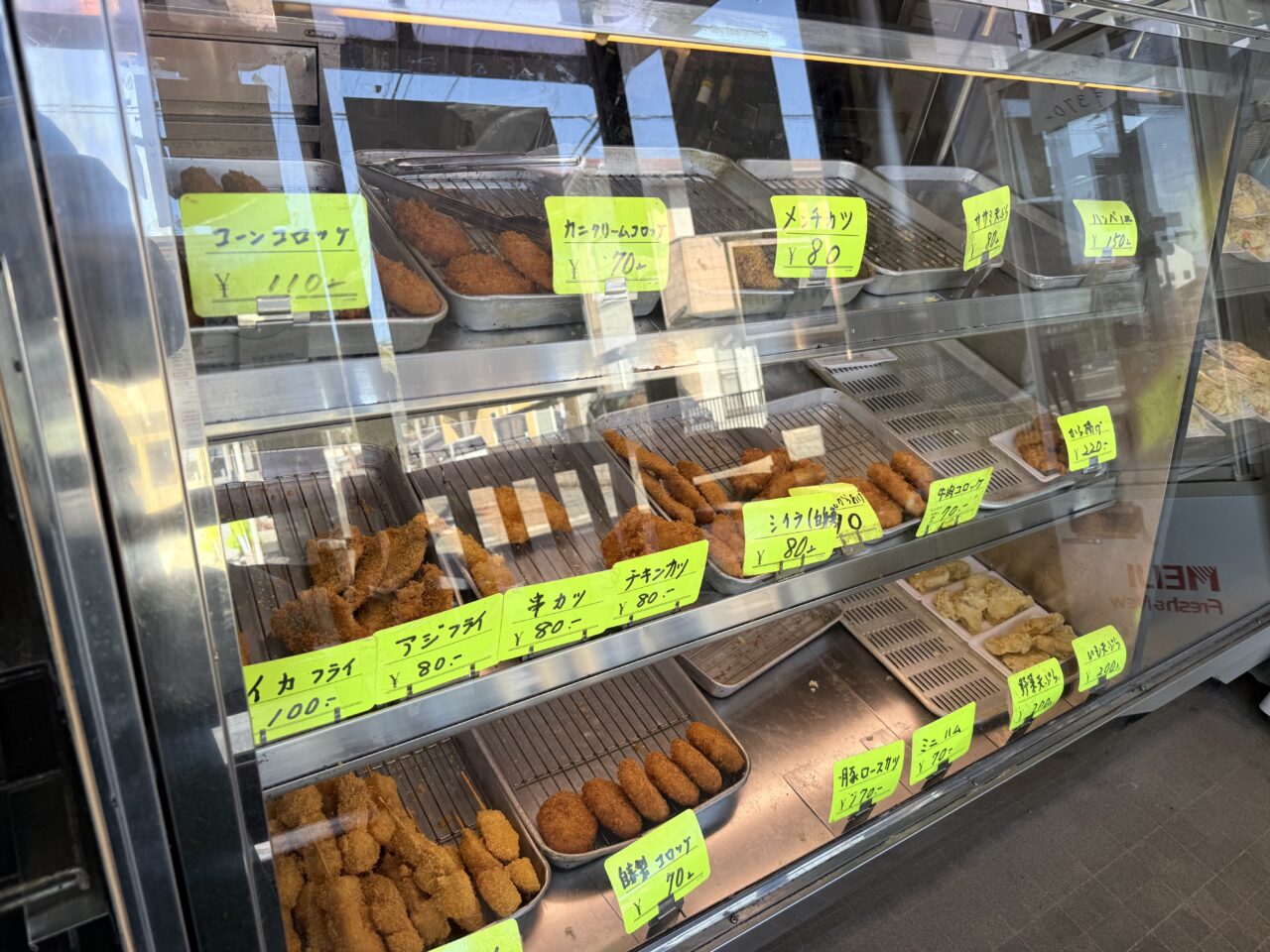 「瀬古屋鳥肉店」は鳥肉を使った商品がたくさん並んでいました。揚げ物のコーナーにはコーンコロッケ、カニクリームコロッケ、メンチカツ、ササミ天ぷら、ハンペン、イカフライ、アジフライ、串カツ、チキンカツ、シイラ、牛肉コロッケ、から揚げ、自家製コロッケなどがありました。