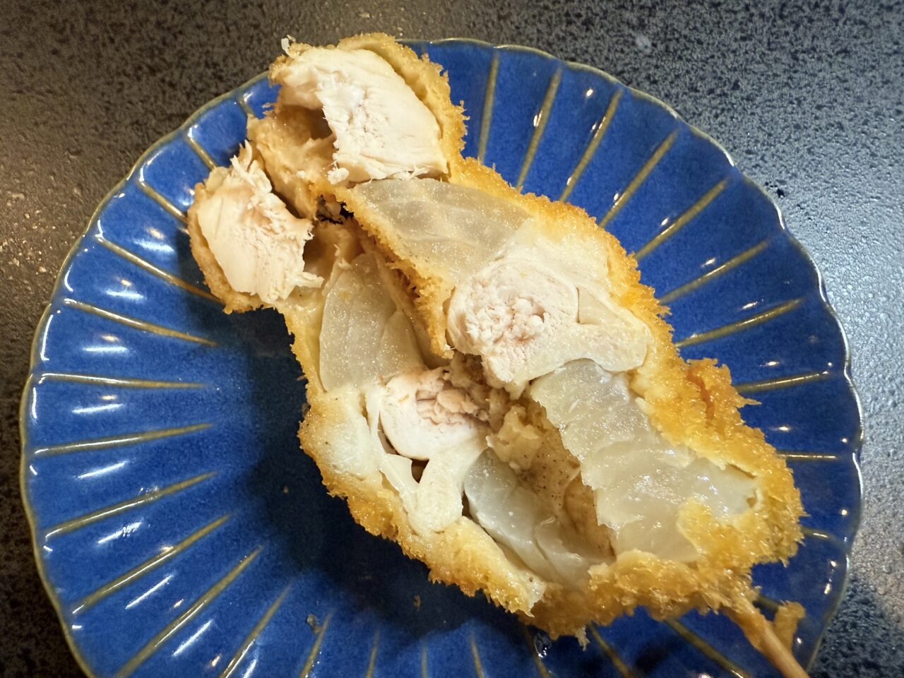 半分に切ってみると、衣がサクサクとしていてしっかりと中の具にくっついていました。中には大きめの玉ねぎと鳥肉が串に刺さっていました。食べてみると鳥肉がふっくらとしていて、玉ねぎの甘さととてもよくあっていました。お肉が鳥なのでヘルシーなのが嬉しいです。