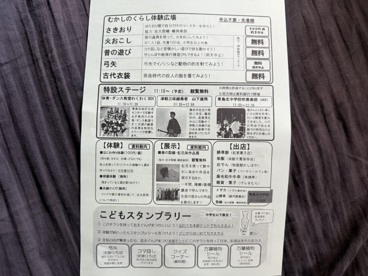 コマ回し・弓矢(雨天中止)・史跡クイズ・万葉植物さがし(2種類)を体験してスタンプ・シール合わせて5つを集めた子どもに志太ぐんが祭り本部にて先着100名に記念品をプレゼント! 参加無料。