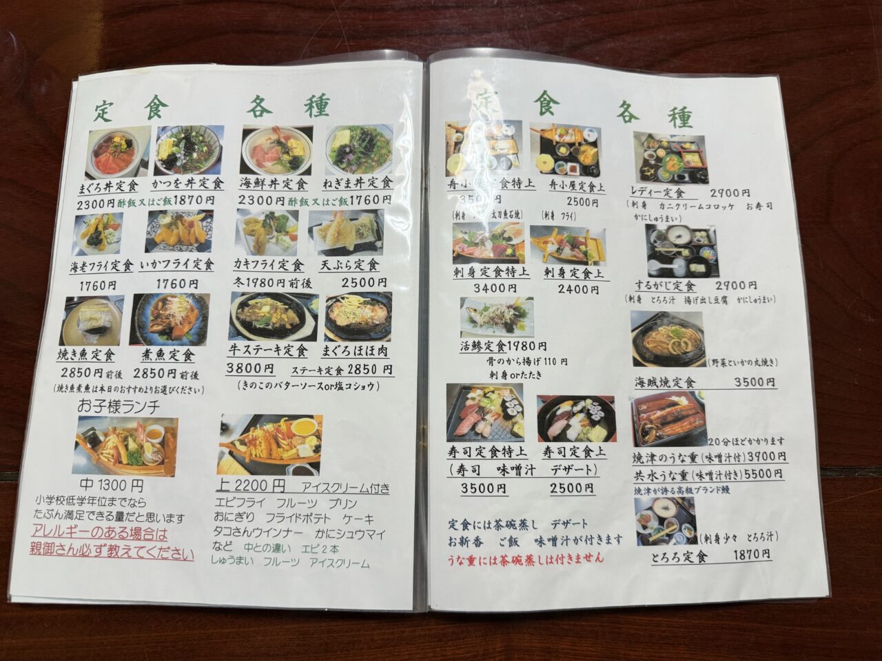 席に案内されるとメニューがテーブルの上に置かれていました。人気の定食は丼、焼き魚、煮魚、舟小屋定食特上、舟小屋定食上、レディー定食などがありました。種類が豊富で迷ってしまいます。